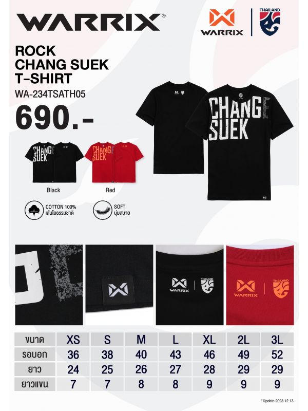เสื้อ WARRIX T-SHIRT เสื้อยืดคอกลมแขนสั้น มาพร้อมลวดลายข้อความ CHANGSUEK ผสานกับพื้นผิวบนข้อความที่โดดเด่นเป็นเอกลักษณ์ ด้านหลัง สกรีนโลโก้ WARRIX กับ โลโก้ทีมชาติไทย